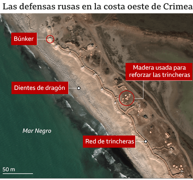 La analista de inteligencia Layla Guest afirma: «Es probable que las fortificaciones se hayan colocado para disuadir cualquier audaz operación ucraniana de atacar Crimea por mar en lugar de por tierra.»