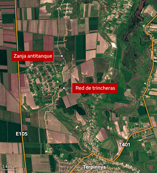La parte superior de la imagen de satélite muestra una zanja antitanque. Estos surcos suelen tener al menos 2,5 metros de profundidad y están diseñados para atrapar a cualquier tanque enemigo que intente cruzarlas.