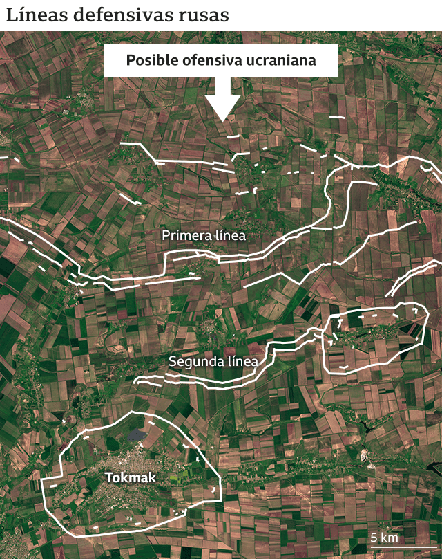 La imagen de satélite de arriba muestra que se ha excavado una red de trincheras en dos líneas al norte de Tokmak, la dirección desde la que Ucrania tendría que atacar.