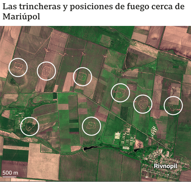 Situadas cerca de la pequeña aldea de Rivnopil, a unos 55 kilómetros al norte de Mariúpol, cada trinchera circular tiene un montículo de tierra en el centro, posiblemente para proteger la artillería o para mantener estables los cañones.