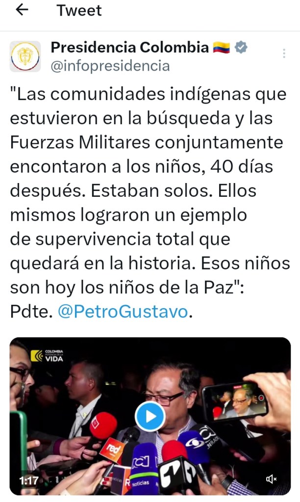 «¡Una alegría para todo el país! Aparecieron con vida los 4 niños que estaban perdidos hace 40 días en la selva colombiana», anunció en su cuenta de Twitter el presidente Gustavo Petro, quien confirmó así la noticia adelantada minutos antes por Caracol Radio.
