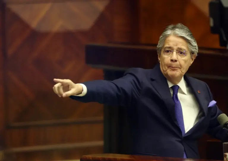 El presidente de Ecuador, Guillermo Lasso, interviene durante un juicio político de censura en su contra, en la sede de la Asamblea Nacional, en Quito (Ecuador). EFE/José Jácome