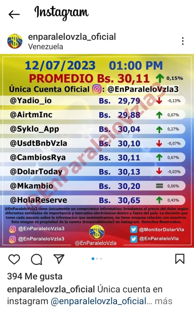 Según las mediciones de la cuenta de Instagram enparalelovzla_oficial, los precios oscilan entre un mínimo de 29,79 bolívares y un máximo de 30,65 bolívares por dólar. Una vez allí, se observa que cuatro de las cuentas que promedia la plataforma tuvieron un alza de su cotización desde 0,07% hasta 0,67%, mientras que una se mantuvo estable y dos cuentas tuvieron una baja del -0,07% en cotización.