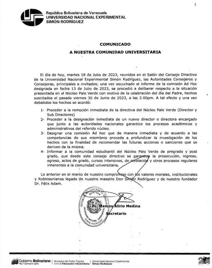 Por medio de un comunicado, la Universidad Nacional Experimental Simón Rodríguez, núcleo Palo Verde ubicado en el Distrito Capital informó que la directiva fue removida, tras filtrase por las redes sociales varios vídeos de directivos en una fiesta con strippers.