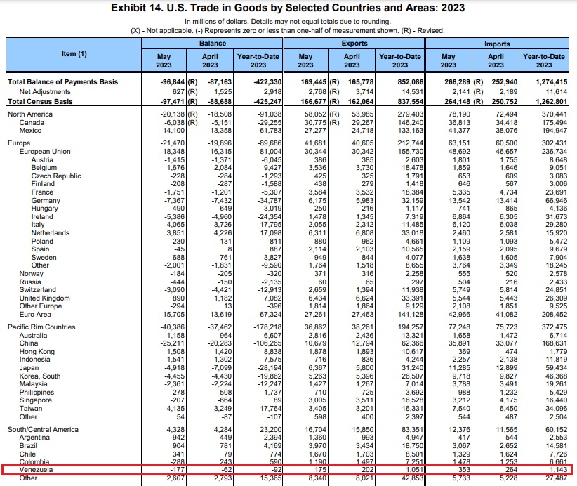 Datos de la Oficina de Análisis Financiero de Estados Unidos (BEA, por sus siglas en inglés) señalan que entre enero y mayo de este año, Venezuela vendió a la economía estadounidense bienes y servicios por el valor de $1.143 millones. Con este número, por primera vez desde 2019 se presenta un balance comercial favorable para Venezuela, pues en estos momentos se evidencia un superávit a favor del país por $92 millones en estos cinco meses del año.