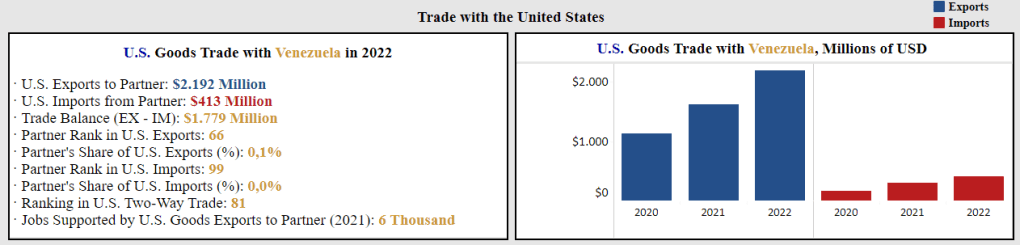 A raíz de la pandemia y las sanciones a la industria petrolera, las exportaciones de Venezuela a Estados Unidos cayeron en picada. Totalizaron $167 millones en 2020, $295 millones en 2021 y $413 millones en 2022.