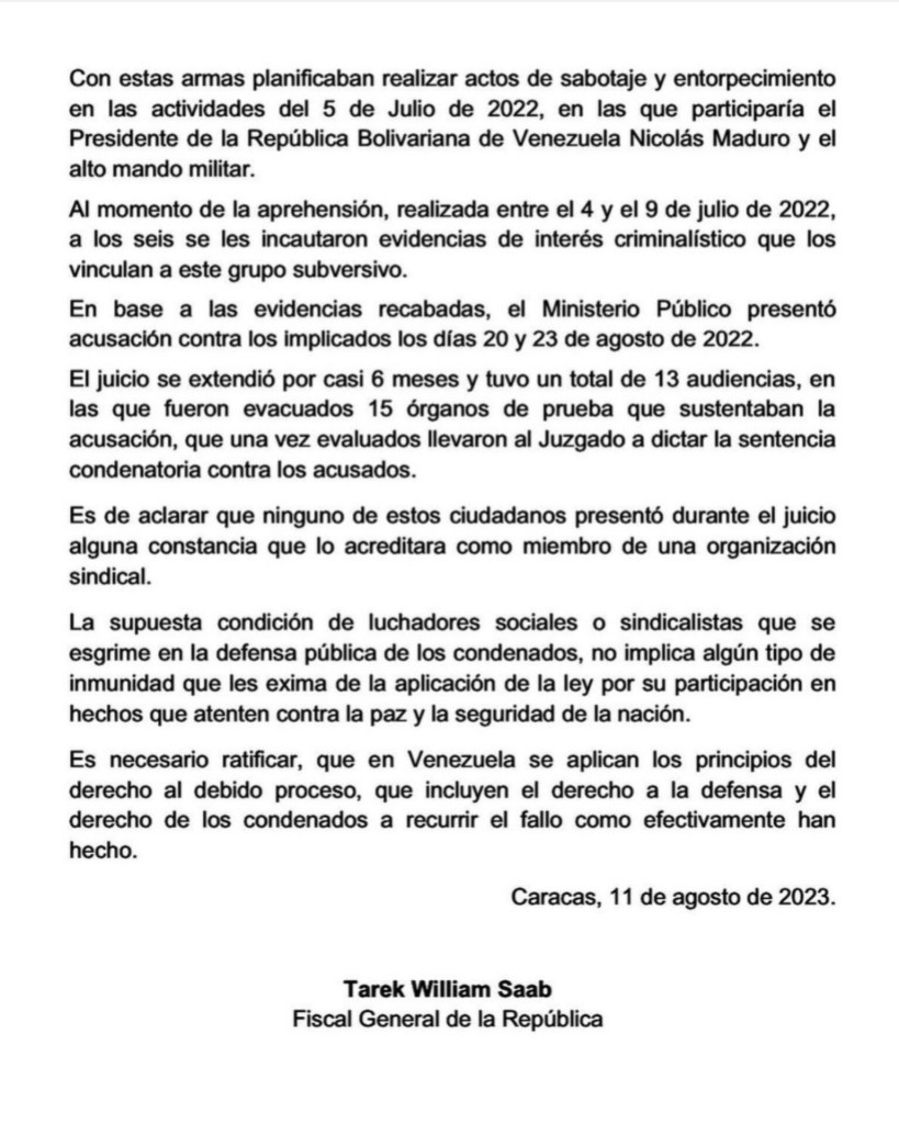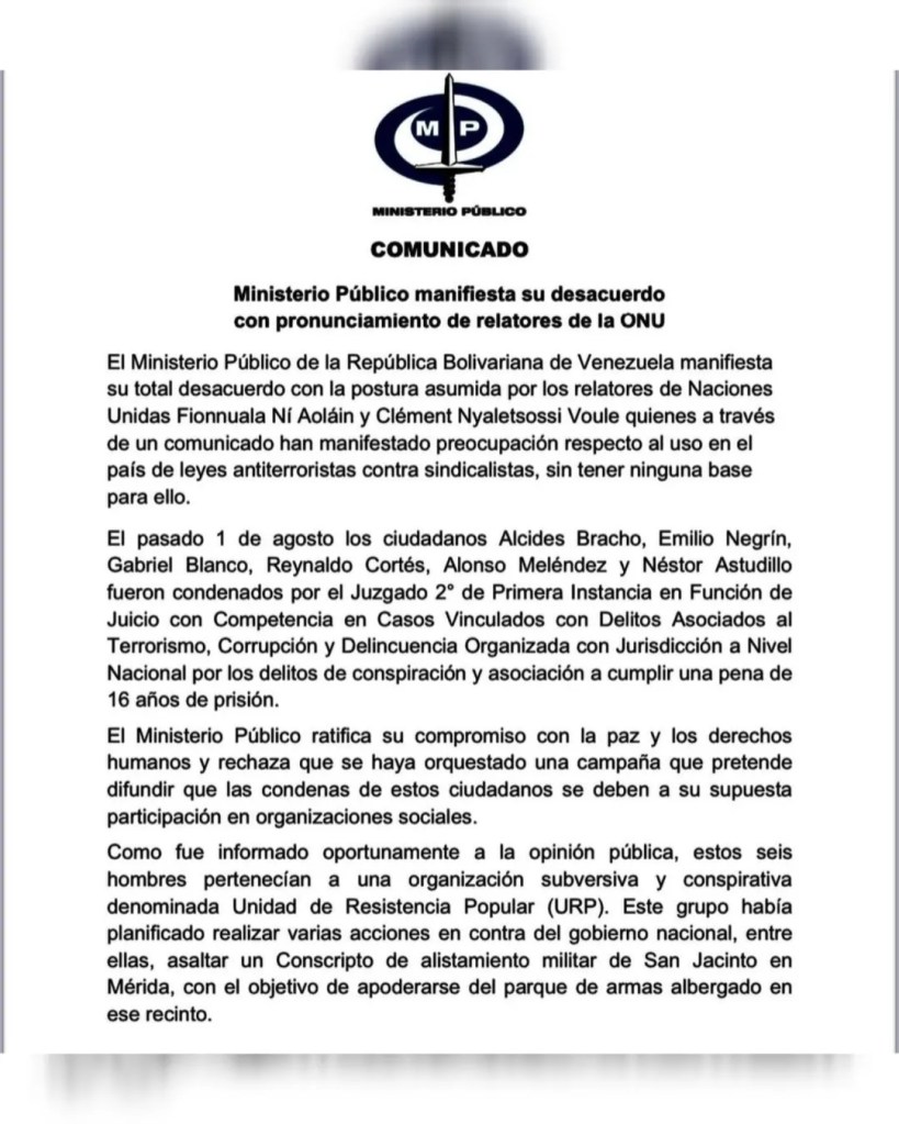 El Ministerio Público, manifiesta su desacuerdo con la postura asumida por los relatores de Naciones Unidas Fionnuala Ní Aoláin y Clément Nyaletsossi Voule, quienes a través de un comunicado han manifestado preocupación respecto al uso de leyes antiterroristas contra sindicalistas.