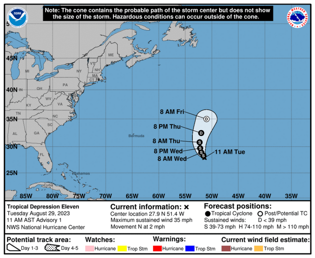 La depresión tropical 11 se formó en el centro del Atlántico el 29 de agosto de 2023 y se pronostica un ligero fortalecimiento.