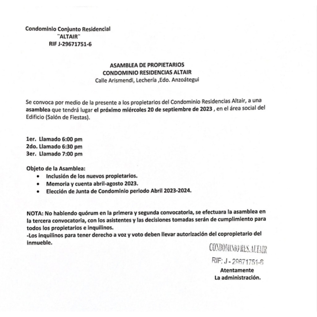 Se convoca a una asamblea de Propietarios del Conjunto Residencial Altair, Lechería, estado Anzoátegui