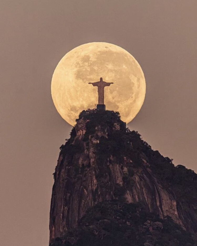 La manera en que fue tomada la fotografía le dio a la escena una asombrosa sensación de escala, en la que la Luna luce irrealmente enorme, con la estatua aparentemente sosteniéndola en un precario equilibrio.