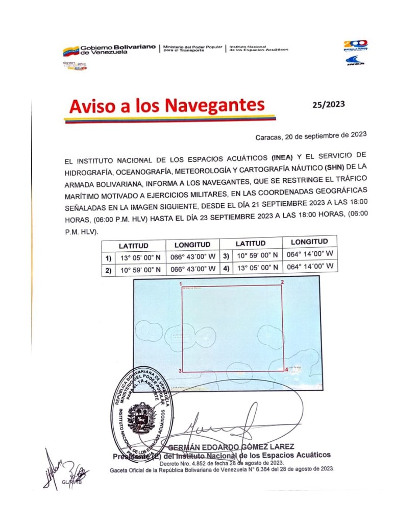 «Les informamos que será RESTRINGIDO EL TRÁFICO MARÍTIMO motivado a los ejercicios militares en las coordenadas geográficas señaladas (…) desde las 6:00pm hasta el día 23 de septiembre a las 6:00pm»