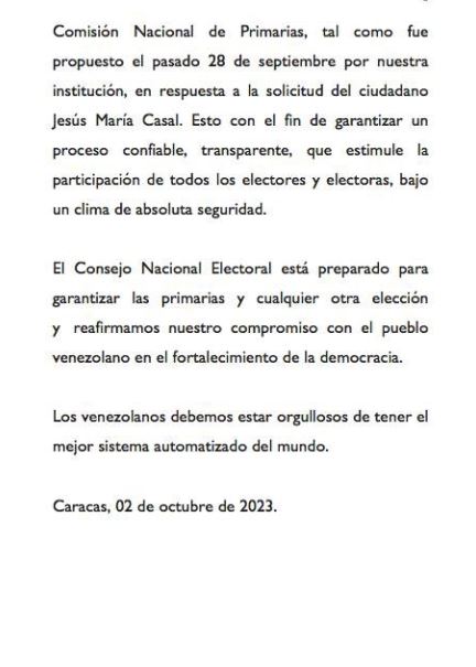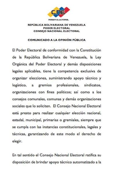 El Consejo Nacional Electoral publicó la tarde este lunes un comunicado donde expresa el rango legal que le otorga de manera exclusiva las responsabilidades en materia de organización electoral, lo que representa un mensaje directo a las primarias de oposición, un oficio en el que cita además al presidente de la Comisión Nacional de Primaria Jesús María Casal.