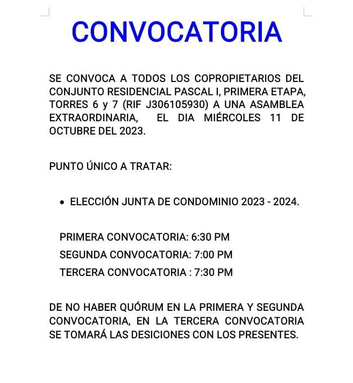 La junta de Condominio del Conjunto Residencial Pascal I, Primera Etapa, Torres 6 y 7, convocan a una Asamblea Extraordinaria para el día miércoles 11 de octubre del 2023.