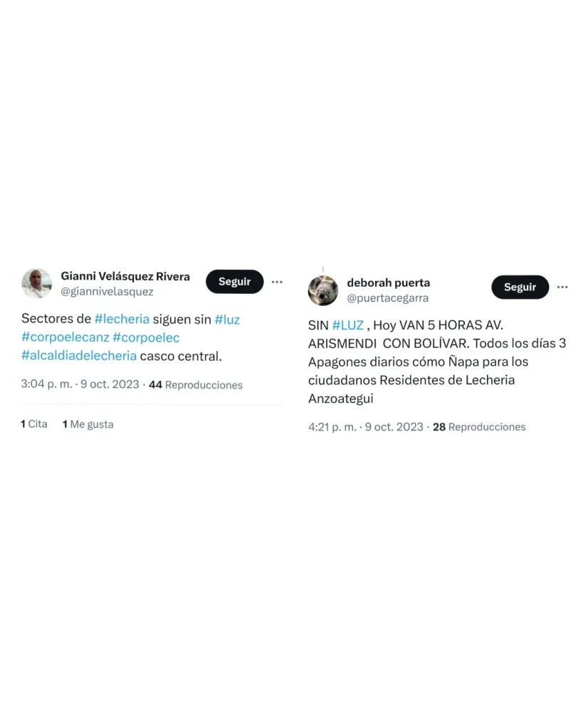 A través de redes sociales, usuarios manifiestan que varios sectores en Lechería están sin energía eléctrica este lunes 9 de octubre, algunos desde las 11 am