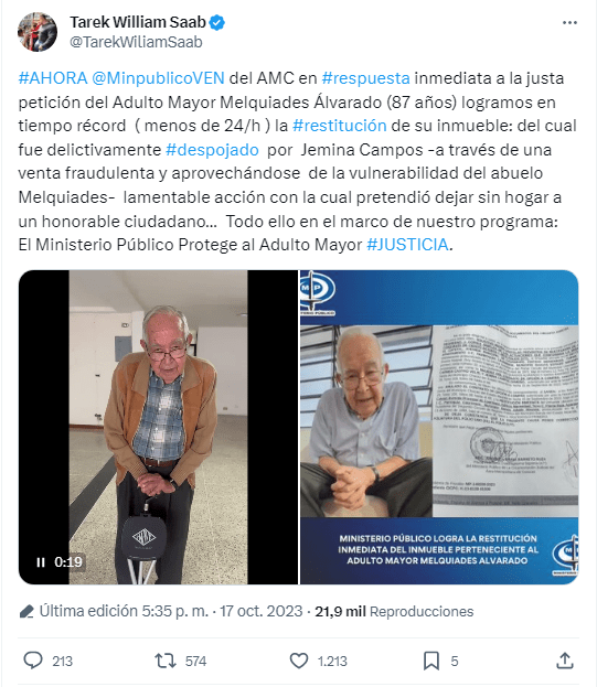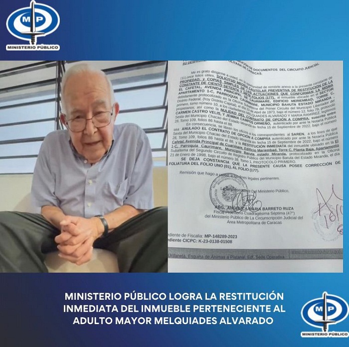 La denuncia realizada por Melquíades Alvarado de 87 años en redes sociales, acusando a su hijo de venderle fraudulentamente su apartamento a una concejal, fue atendida en tiempo récord por el Ministerio Publico, ente que recuperó en menos de 24 horas la propiedad del adulto mayor y su esposa.