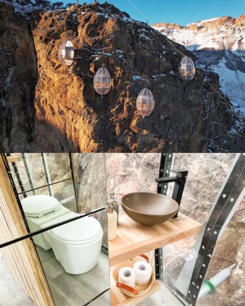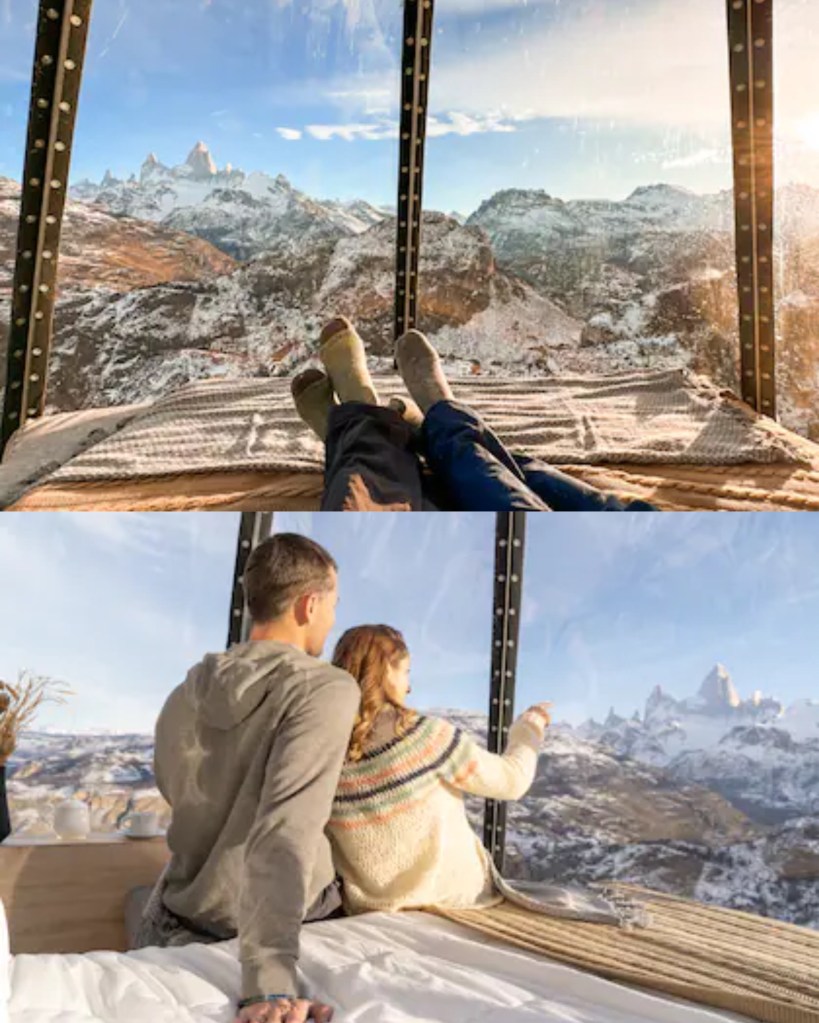 Cuatro cápsulas adosadas a un paredón de roca de 270 metros de altura en las que se podrá pasar la noche frente al Fitz Roy: cúpulas de policarbonato que contienen módulos habitacionales.