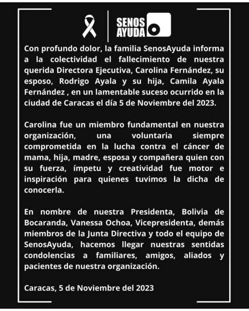«Carolina fue un miembro fundamental de nuestra organización, una voluntaria siempre comprometida con la lucha contra el cáncer de mama. Hija, madre, esposa y socia que con su fuerza, empuje y creatividad fue motor e inspiración para quienes tuvimos la dicha de conocerla”, se lee en la publicación.