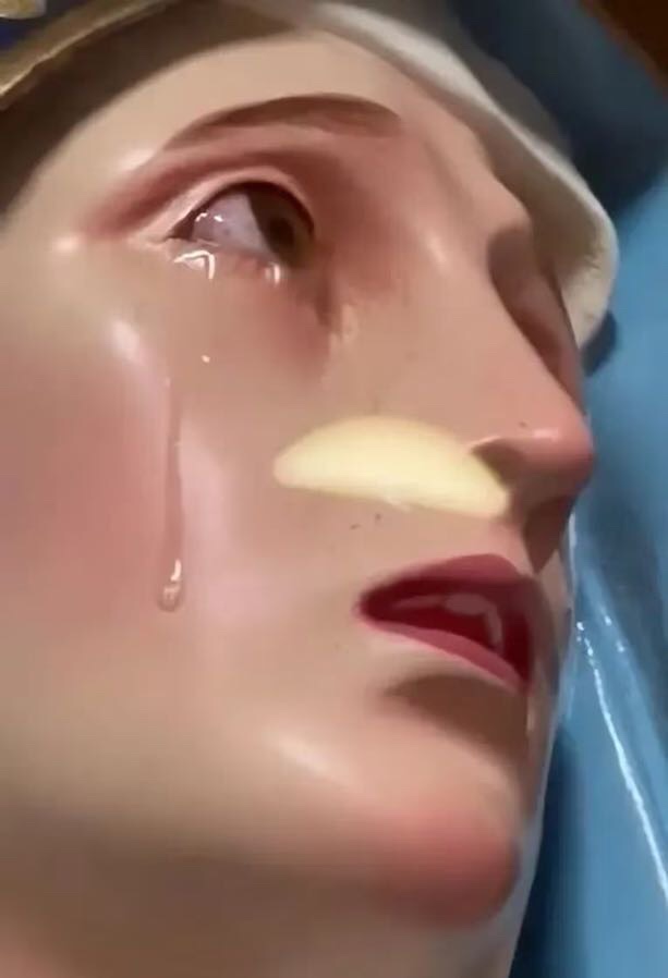 Las imágenes muestran a la estatua, llamada Virgen de los Dolores, envuelta en cristal, con una gota de agua que parece salir del ojo de la estatua y correr por su rostro.