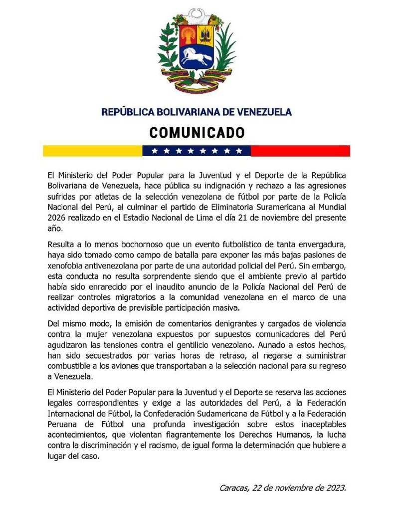 El Ministerio del Poder Popular para la Juventud y el Deporte, en voz del ministro Mervin Maldonado, emitió un comunicado en el que rechaza los actos en contra de la selección Vinotinto en Lima.