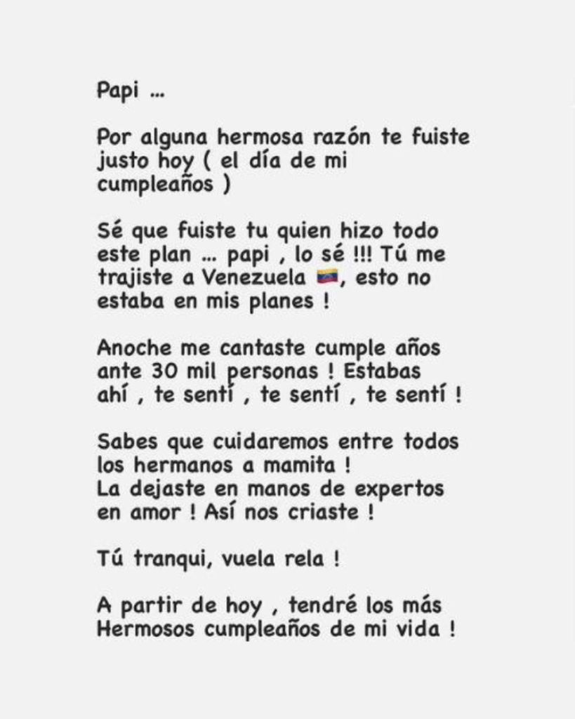 En Instagram el también productor musical compartió una carta con estas palabras: “Anoche me cantaste cumpleaños ante 30 mil personas! Estabas ahí, te sentí, te sentí, te sentí! Sabes que cuidaremos entre todos los hermanos a mamita! La dejaste en manos de expertos en amor! Así nos criaste! Tú tranqui, vuela rela”.