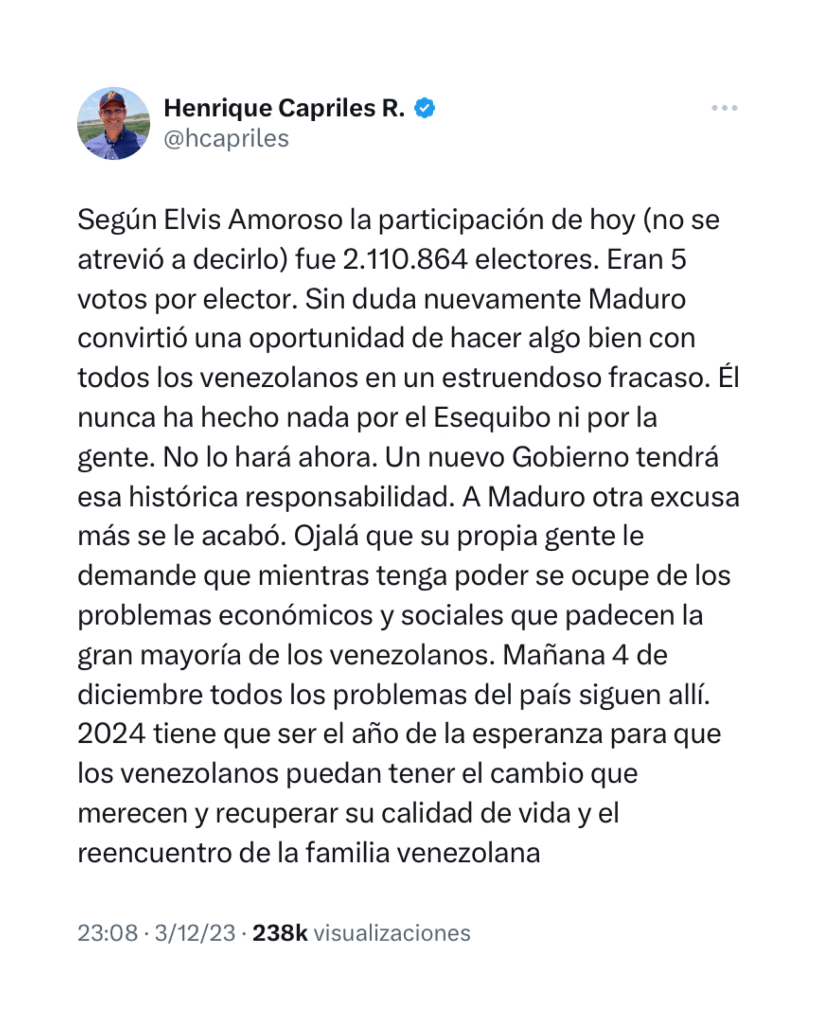 El dirigente opositor Henrique Capriles dijo este domingo que la participación en el referendo no vinculante celebrado en Venezuela, relacionado con la disputa territorial con Guyana, fue de 2.110.864 de electores, lo que supone una abstención del 89,8 % en un censo con 20,69 millones de votantes.