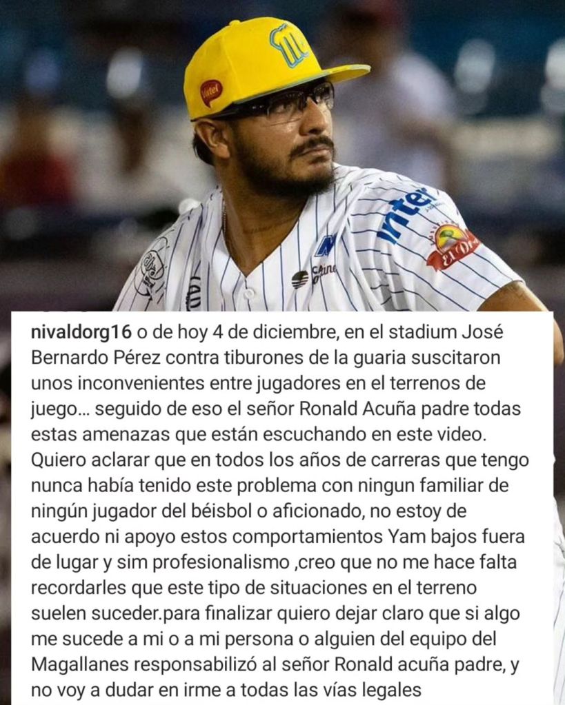 Nivaldo Rodríguez compartió los fuertes mensajes que recibió por parte de Ronald Acuña padre tras el duelo de ayer entre Tiburones de La Guaira y Navegantes del Magallanes junto a un comunicado