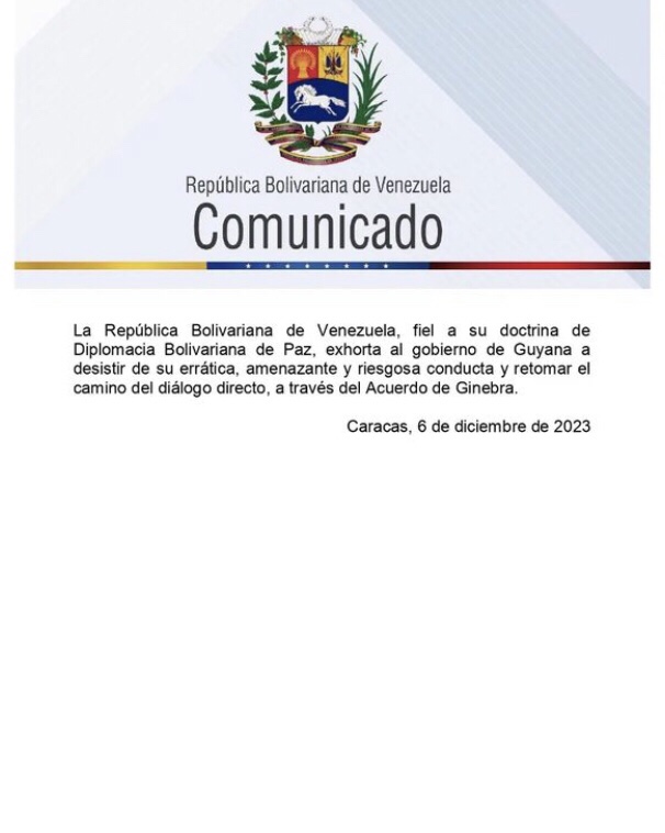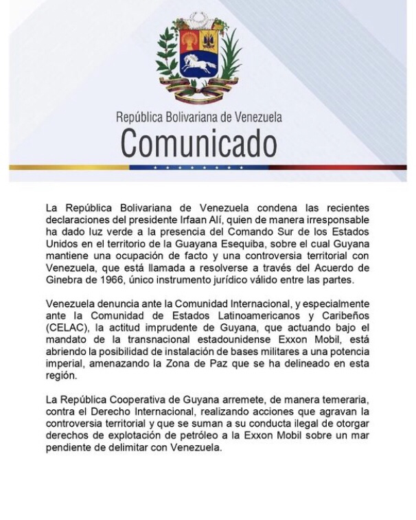 En un comunicado, divulgado por la cancillería este miércoles 6 de diciembre, el Ejecutivo venezolano denunció que el presidente Irfaan Ali «de manera irresponsable ha dado luz verde a la presencia del Comando Sur de los Estados Unidos en el territorio de la Guayana Esequiba, sobre el cual Guyana mantiene una ocupación de facto».