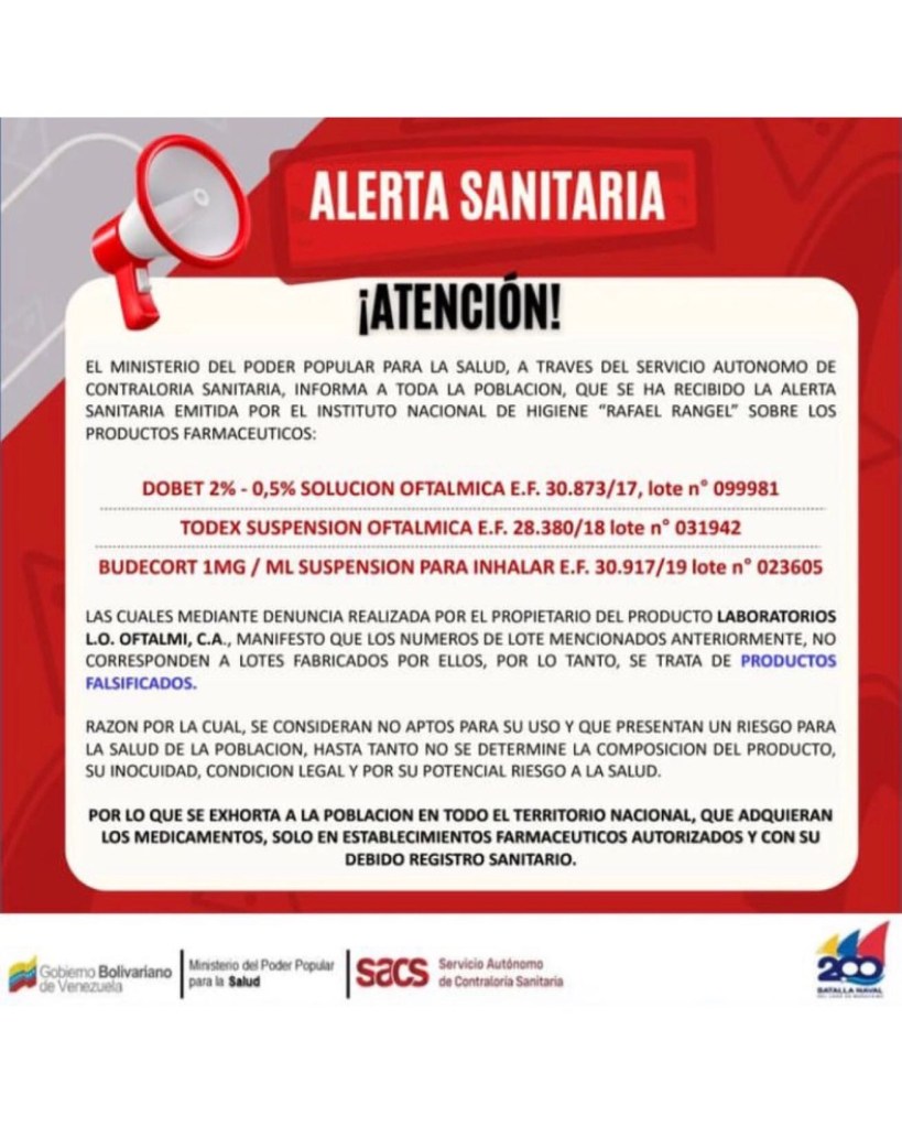 El Ministerio de Salud venezolano alertó este 6 de diciembre que los productos Dobet 2%, Todex (solución oftalmológica) y Budecort 1mg (suspensión para inhalar) en sus lotes 099981, 031942 y 023605 son medicamentos falsificados y presentan un alto riesgo para la salud.