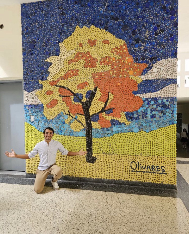 «Con una visión artística que va más allá del lienzo, Olivares también ha creado murales en diversos países y ha reciclado hasta 1,5 millones de tapas de botellas para crearlos; el más grande de estos, para el que utilizó 400.000 tapas de botella, ocupa 285 metros cuadrados y se encuentra en Guatire», agregó.