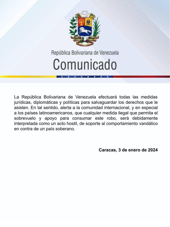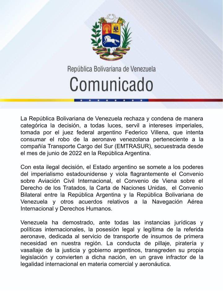 Con ello se “intenta consumar el robo de la aeronave venezolana perteneciente a la compañía Transporte Cargo del Sur (EMTRASUR), secuestrada desde el mes de junio de 2022 en la República Argentina”, se expresa en un comunicado oficial.