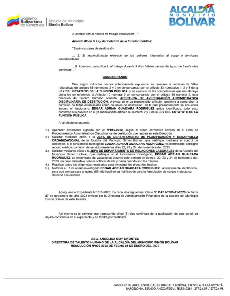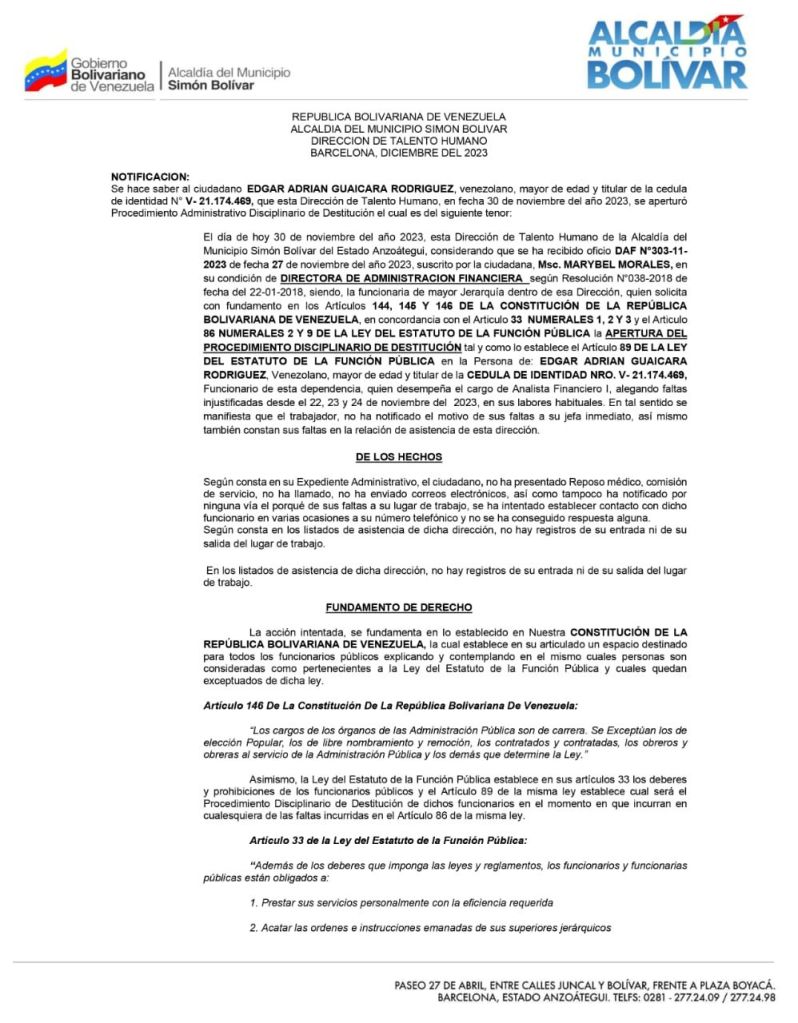 El día de hoy 30 de noviembre del año 2023, esta Dirección de Talento Humano de la Alcaldía del Municipio Simón Bolívar del Estado Anzoátegui, considerando que se ha recibido oficio DAF N°303-11-2023 de fecha 27 de noviembre del año 2023, suscrito por la ciudadana, Msc. MARYBEL MORALES, en su condición de DIRECTORA DE ADMINISTRACION FINANCIERA según Resolución N°038-2018 de fecha del 22-01-2018, siendo, la funcionaria de mayor Jerarquía dentro de esa Dirección, quien solicita con fundamento en los Artículos 144, 145 Y 146 DE LA CONSTITUCIÓN DE LA REPÚBLICA BOLIVARIANA DE VENEZUELA, en concordancia con el Articulo 33 NUMERALES 1, 2 Y 3 y el Articulo 86 NUMERALES 2 Y 9 DE LA LEY DEL ESTATUTO DE LA FUNCIÓN PÚBLICA la APERTURA DEL PROCEDIMIENTO DISCIPLINARIO DE DESTITUCIÓN tal y como lo establece el Artículo 89 DE LA LEY DEL ESTATUTO DE LA FUNCIÓN PÚBLICA en la Persona de: EDGAR ADRIAN GUAICARA RODRIGUEZ, Venezolano, mayor de edad y titular de la CEDULA DE IDENTIDAD NRO. V- 21.174.469, Funcionario de esta dependencia, quien desempeña el cargo de Analista Financiero I, alegando faltas injustificadas desde el 22, 23 y 24 de noviembre del 2023, en sus labores habituales. En tal sentido se manifiesta que el trabajador, no ha notificado el motivo de sus faltas a su jefa inmediato, así mismo también constan sus faltas en la relación de asistencia de esta dirección.