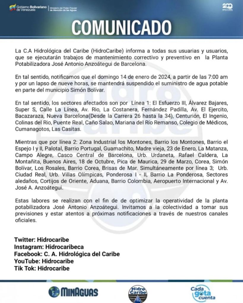 Informó la Hidrológica del Caribe que este domingo 14 de Enero por un lapso de nueve horas se realizará mantenimiento preventivo y correctivo en la planta potabilizadora José Antonio Anzoátegui de Barcelona, por lo cual, parte del municipio Simón Bolívar se mantendrá suspendido el servicio de agua potable.
