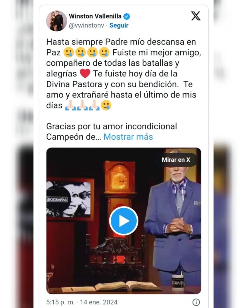 A través de la red social X, Vallenilla hijo publicó un emotivo mensaje a su padre: «Hasta siempre Padre mío descansa en Paz», y a su vez expresó: «Fuiste mi mejor amigo, compañero de todas las batallas y alegrías. Te fuiste hoy día de la Divina Pastora y con su bendición. Te amo y extrañaré hasta el último de mis días».