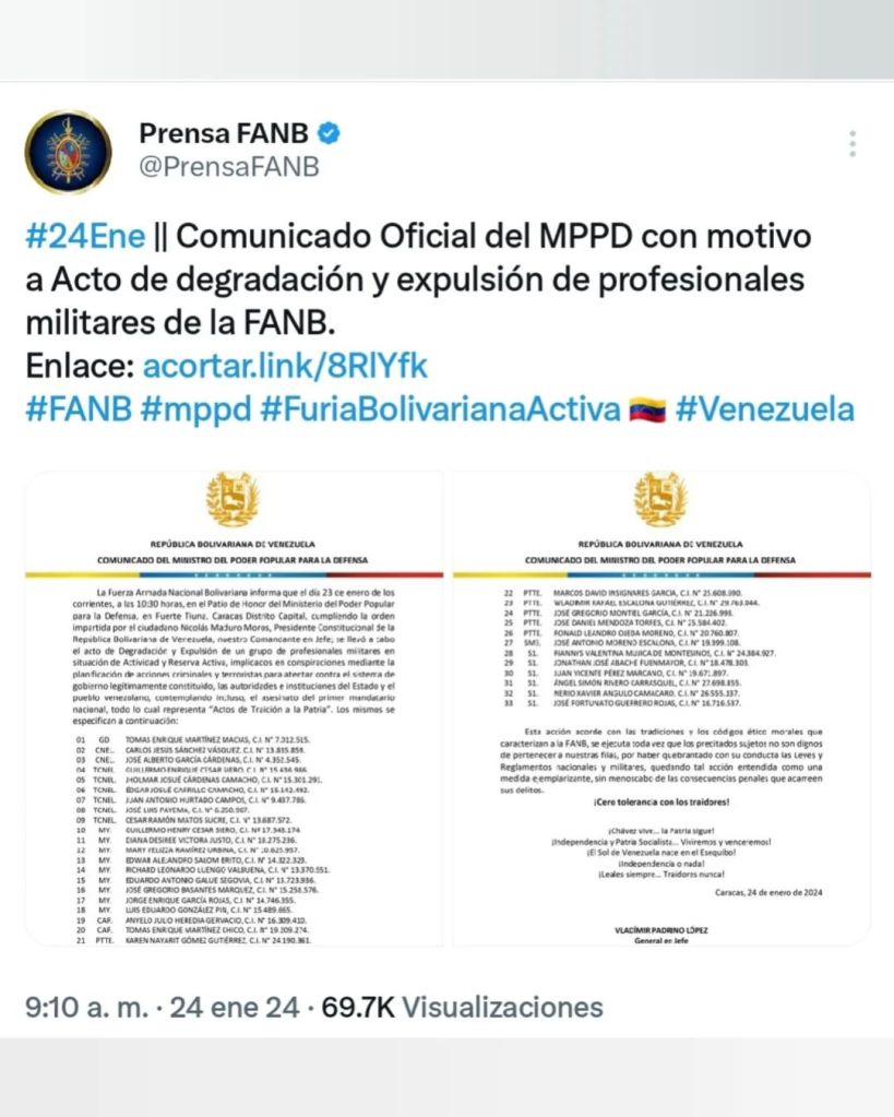 En un comunicado, el ministro explicó que estos militares, cuyos nombres, rangos y números de identificación están especificados en el documento, estuvieron «implicados en conspiraciones mediante la planificación de acciones criminales y terroristas para atentar contra el sistema de gobierno legítimamente constituido, las autoridades e instituciones del Estado y el pueblo venezolano»