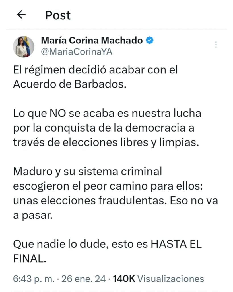Luego que el TSJ ratificara este viernes 26 de enero que María Corina Machado está inhabilitada hasta el 2036, la líder de Vente Venezuela usó su cuenta de Twitter para fijar posición