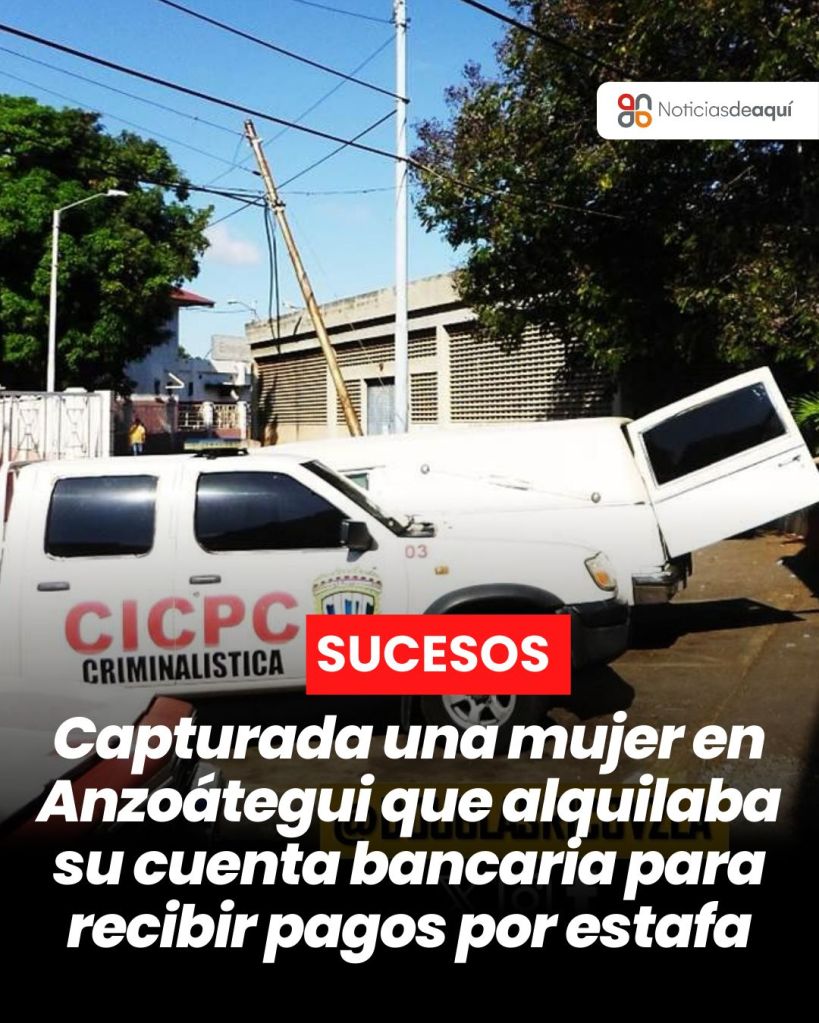 Pesquisas de la Delegación Municipal Barcelona, al recibir una denuncia por parte de una de las víctimas, iniciaron labores de investigación de campo, las cuales permitieron ubicar y capturar a una mujer de 34 años de edad, por estafa, en la parroquia El Carmen, municipio Simón Bolívar, estado Anzoátegui.