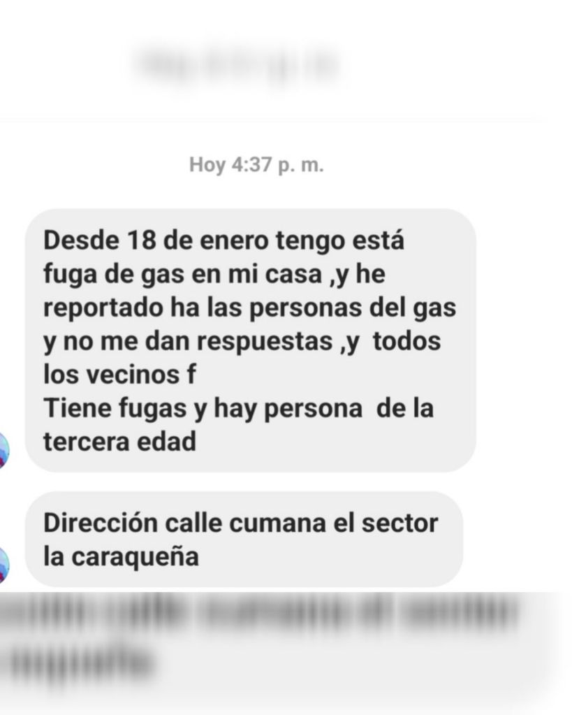 A través de nuestra mensajería directa la ciudadana, Luysis Paruta reporta que desde el 18 de enero tiene una fuga de gas en su casa ubicada en la calle Cumaná sector La Caraqueña de Puerto La Cruz.