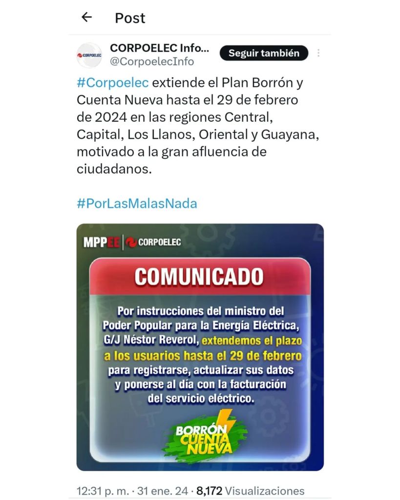 La empresa Corpoelec informó este miércoles 31 de enero que extendieron el Plan Borrón y Cuenta Nueva hasta el 29 de febrero de 2024 en las regiones Central, Capital, Los Llanos, Oriental y Guayana, motivado a la gran afluencia de ciudadanos.