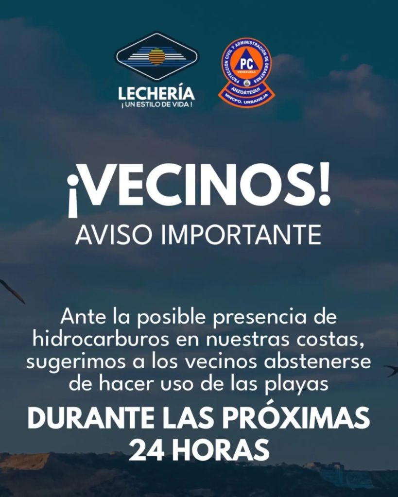 La alcaldía de Lechería y Protección Civil Municipal emitieron un aviso para informar que debido a «posible presencia de hidrocarburos en Playa Lido» piden a los vecinos abstenerse de hacer uso de este balneario en las próximas 24 horas.