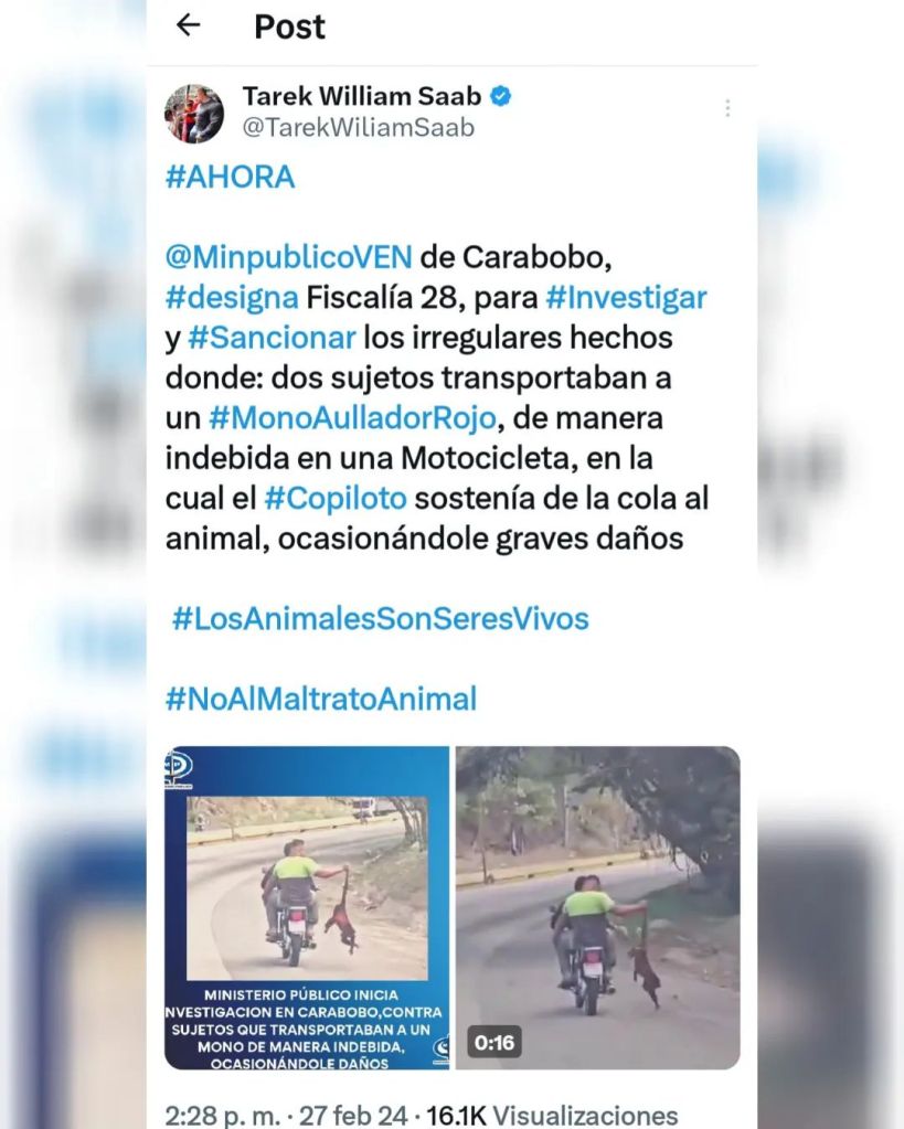 El fiscal general de la República, Tarek William Saab informó este martes 27 de febrero, a través de su cuenta de X que el Ministerio Público de Carabobo designó a la Fiscalía 28, para investigar y sancionar a dos sujetos que transportaban a un Mono Aullador Rojo, de manera indebida en una Motocicleta, ocasionándole daño al animal.