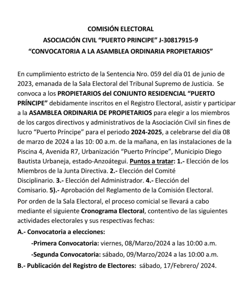 Se convoca a los PROPIETARIOS del CONJUNTO RESIDENCIAL “PUERTO PRÍNCIPE” debidamente inscritos en el Registro Electoral, asistir y participar a la ASAMBLEA ORDINARIA DE PROPIETARIOS para elegir a los miembros de los cargos directivos y administrativos de la Asociación Civil sin fines de lucro “Puerto Príncipe” para el periodo 2024-2025, a celebrarse del día 08 de marzo de 2024 a las 10: 00 a.m. de la mañana, en las instalaciones de la Piscina 4, Avenida R7, Urbanización “Puerto Príncipe”, Municipio Diego Bautista Urbaneja, estado-Anzoátegui.
