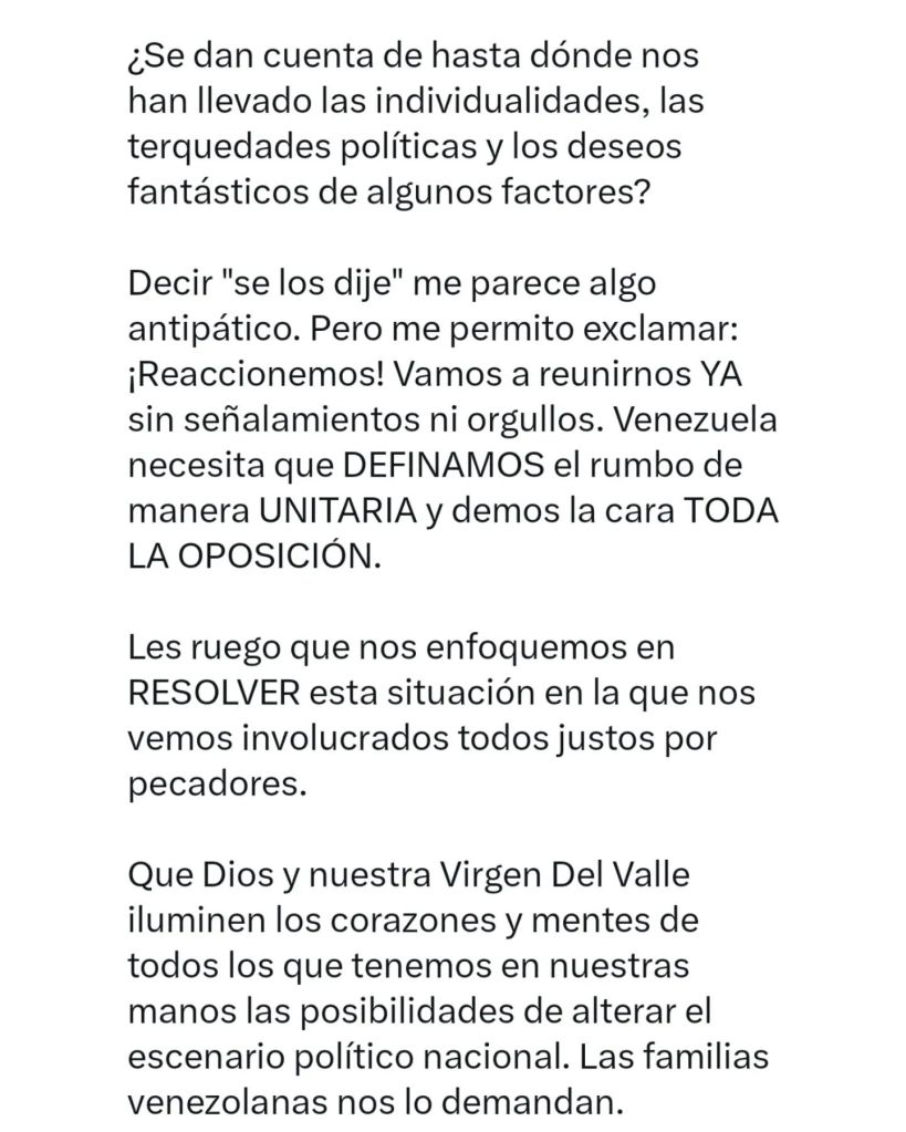 Que Dios y nuestra Virgen Del Valle iluminen los corazones y mentes de todos los que tenemos en nuestras manos las posibilidades de alterar el escenario político nacional. Las familias venezolanas nos lo demandan».