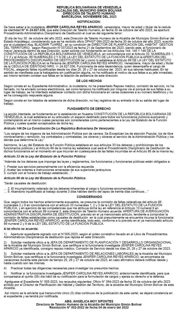 El día de hoy 30 de octubre del año 2023, esta Dirección de Talento Humano de la Alcaldía del Municipio Simón Bolívar del Estado Anzoátegui, considerando que se ha recibido oficio DPHGT 064-2023 de fecha 30 de octubre del año 2023, suscrito por el ciudadano Abg. BLADIMIR TUAREZ , en su condición de DIRECTOR DE PLANIFICACION DEL HABITAT GESTION DEL TERRITORIO, según Resolución N°3372023 de fecha 21 de Septiembre del 2023, siendo este, el funcionario de mayor Jerarquía dentro de esa Dirección, quien solicita con fundamento en los Artículos 144, 145 Y 146 DE LA CONSTITUCIÓN DE LA REPÚBLICA BOLIVARIANA DE VENEZUELA, en concordancia con el Articulo 33 NUMERALES 1, 2 Y 3 y el Articulo 86 NUMERALES 2 Y 9 DE LA LEY DEL ESTATUTO DE LA FUNCIÓN PÚBLICA la APERTURA DEL PROCEDIMIENTO DISCIPLINARIO DE DESTITUCIÓN tal y como lo establece el Artículo 89 DE LA LEY DEL ESTATUTO DE LA FUNCIÓN PÚBLICA en la Persona de:JENIFER CAROLINA REYES APARICIO, Venezolana, mayor de edad y titular de la CEDULA DE IDENTIDAD NRO. V- 24.827.036, Funcionaria de esta dependencia, quien desempeña el cargo de FISCAL, alegando faltas injustificadas desde los días 25, 26 y 27 de octubre del 2023, en sus labores habituales. En tal sentido se manifiesta que la trabajadora sin justificación alguna, no ha notificado el motivo de sus faltas a su jefe inmediato, así mismo también constan sus faltas en la relación de asistencia de esta dirección.