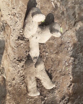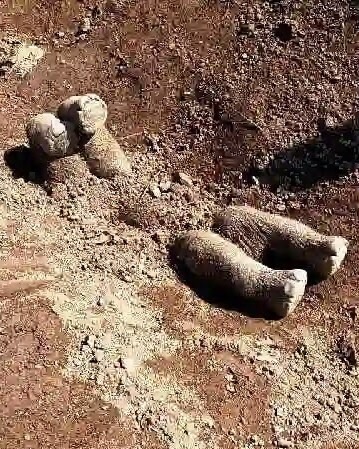 Pequeñas crías de elefantes enterradas con sus patas al aire.