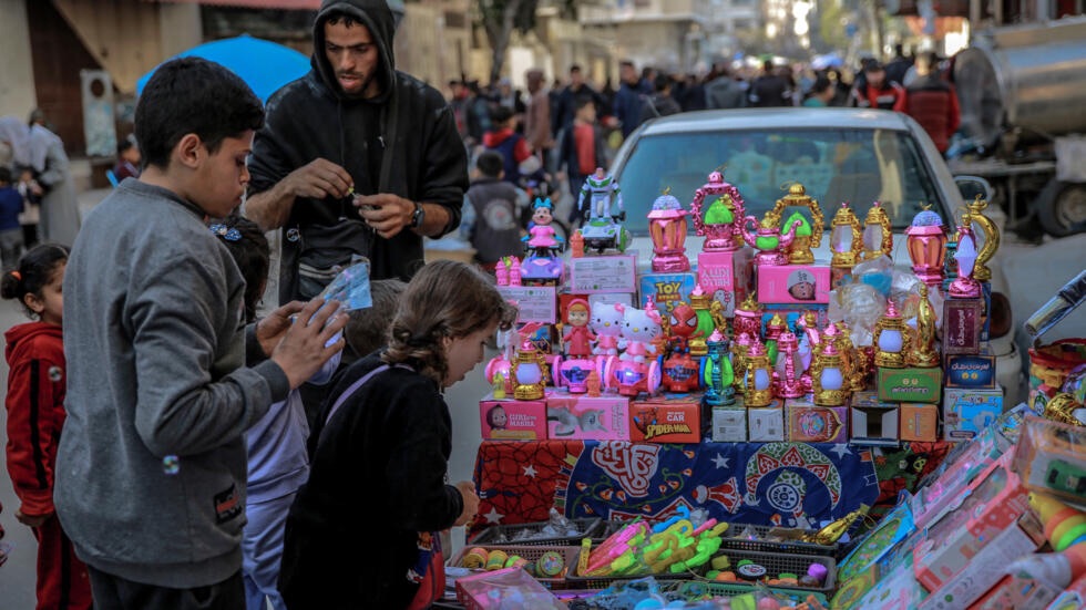 Las plegarias del domingo por la noche se celebraron al aire libre entre las ruinas de edificios derribados. Algunas personas colgaron guirnaldas de luz y decoraciones en abarrotados campamentos de carpas, y un video de una escuela de Naciones Unidas convertida en refugio mostraba niños que bailaban y rociaban espuma mientras un hombre cantaba por un altavoz.