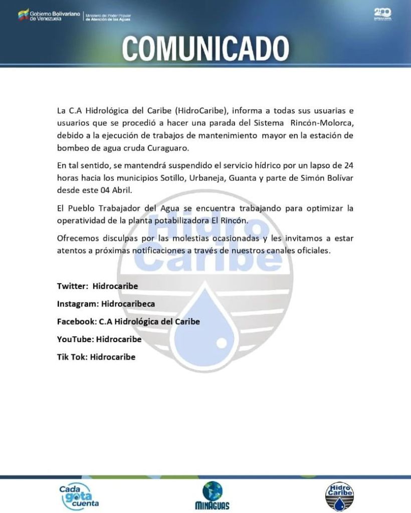 La Hidrológica del Caribe informó que durante 24 horas no habrá servicio de distribución de agua potable debido a una parada del Sistema Rincón – Molorca, para ejecutar mantenimiento en la estación de bombeo de agua cruda Curaguaro.