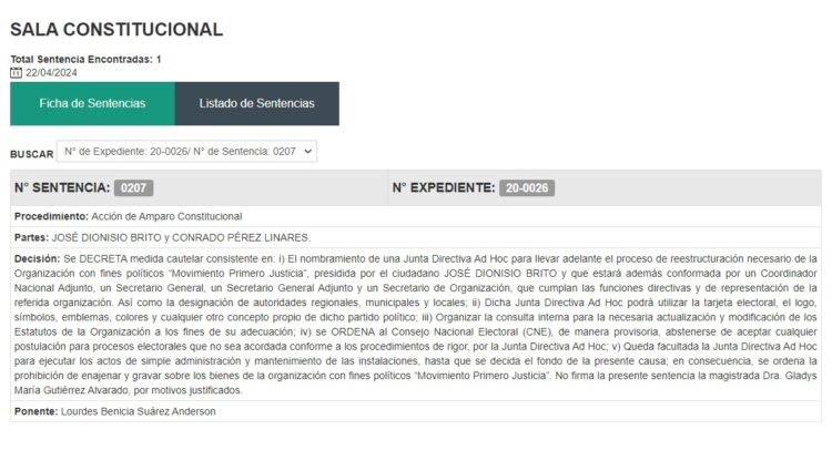 La Sala Constitucional del TSJ decretó una medida cautelar que decide el «nombramiento de una Junta Directiva Ad Hoc para llevar adelante el proceso de reestructuración necesario de la Organización con fines políticos Movimiento Primero Justicia, presidida por el ciudadano JOSÉ DIONISIO BRITO y que estará además conformada por un Coordinador Nacional Adjunto, un Secretario General, un Secretario General Adjunto y un Secretario de Organización, que cumplan las funciones directivas y de representación de la referida organización. Así como la designación de autoridades regionales, municipales y locales».