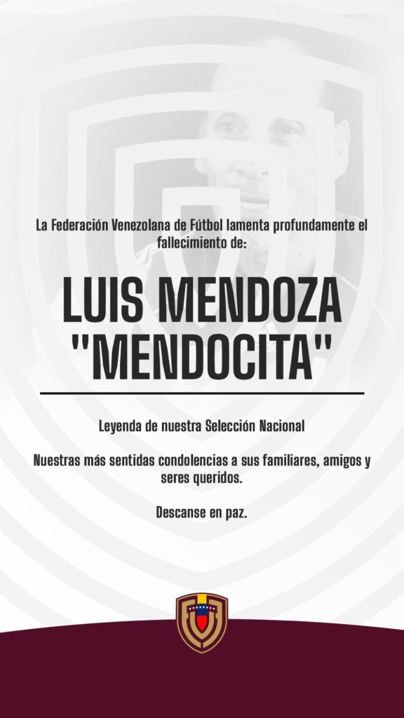 «La Federación Venezolana de Fútbol lamenta el sensible fallecimiento de Luis Mendoza, conocido como ‘Mendocita’, leyenda de nuestra selección nacional. Nuestras más sentidas condolencias a sus familiares, amigos y seres queridos», señaló en su cuenta en la red social X.