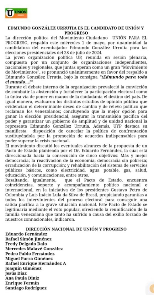 La dirección política del partido Unión y Progreso (UyP), presidida por el dirigente político Eduardo Fernández, anuncia su respaldo a la candidatura opositora de Edmundo González Urrutia para las elecciones presidenciales del 28 de julio.