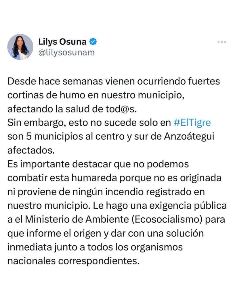 Es importante destacar que no podemos combatir esta humareda porque no es originada ni proviene de ningún incendio registrado en nuestro municipio. Le hago una exigencia pública a el Ministerio de Ambiente (Ecosocialismo) para que informe el origen y dar con una solución inmediata junto a todos los organismos nacionales correspondientes”.